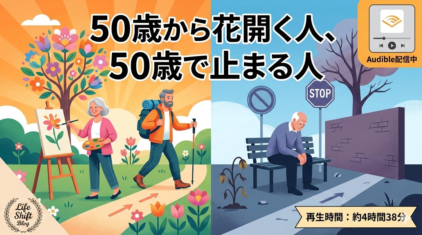 『50歳から花開く人、50歳で止まる人』は、有川真由美氏による人生後半の生き方を提案する一冊です。結論として、本書はAudibleで配信されており、聴き放題の対象作品として「ながら聴き」で楽しめます。再生時間は約4時間38分で、通勤や家事の合間にも無理なく聴き切れるボリュームです。