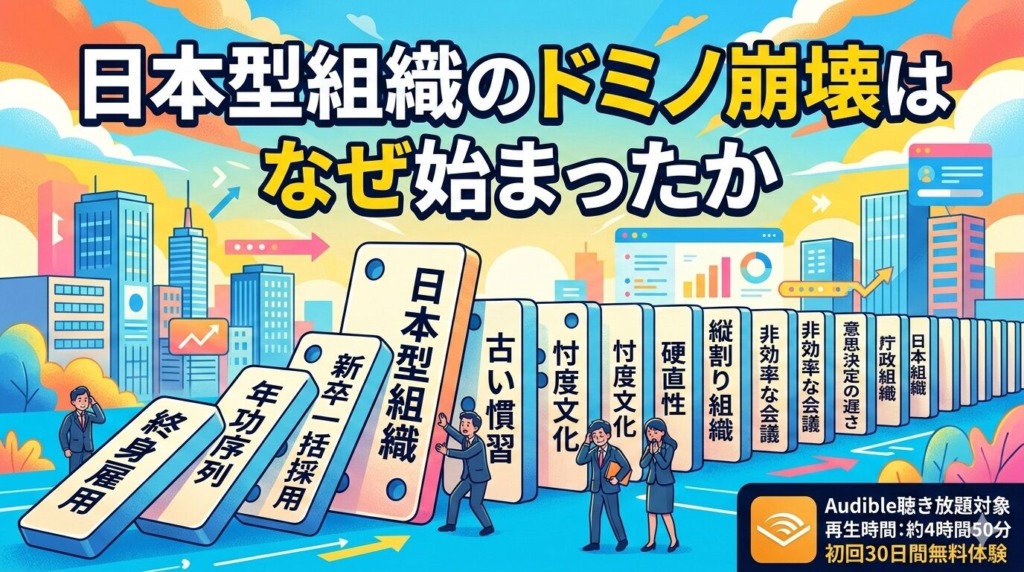 『日本型組織のドミノ崩壊はなぜ始まったか』はAudible聴き放題の対象?配信状況・口コミ・お得な聴き方を徹底解説