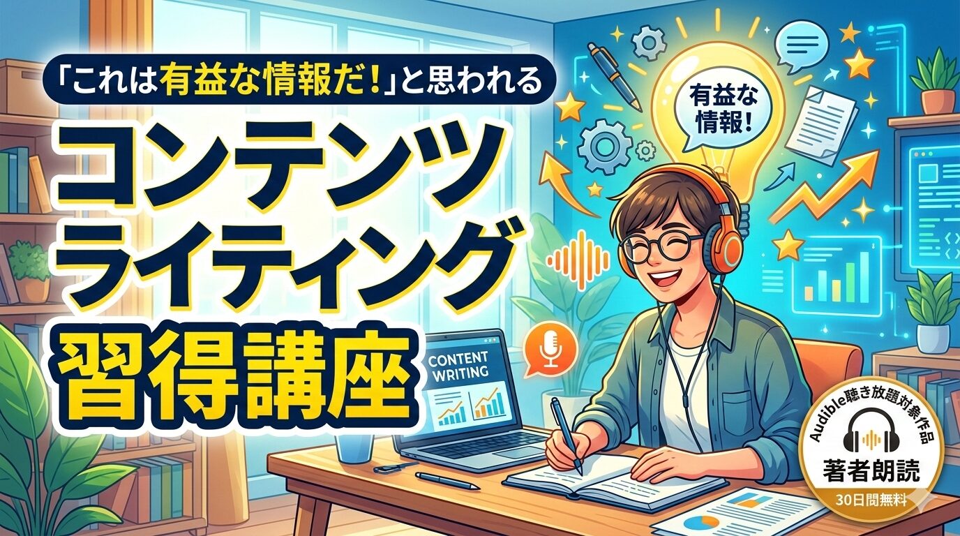 『「これは有益な情報だ!」と思われるコンテンツライティング習得講座』は、現役Webマーケターの現場知見を凝縮した実践的なライティング教材です。Audible聴き放題の対象作品であるため、月額会員なら追加料金なしで学ぶことができます。約2時間17分という手頃なボリュームで、読者の心を動かすライティングの本質と具体的テクニックを同時に習得できる点が大きな魅力です。