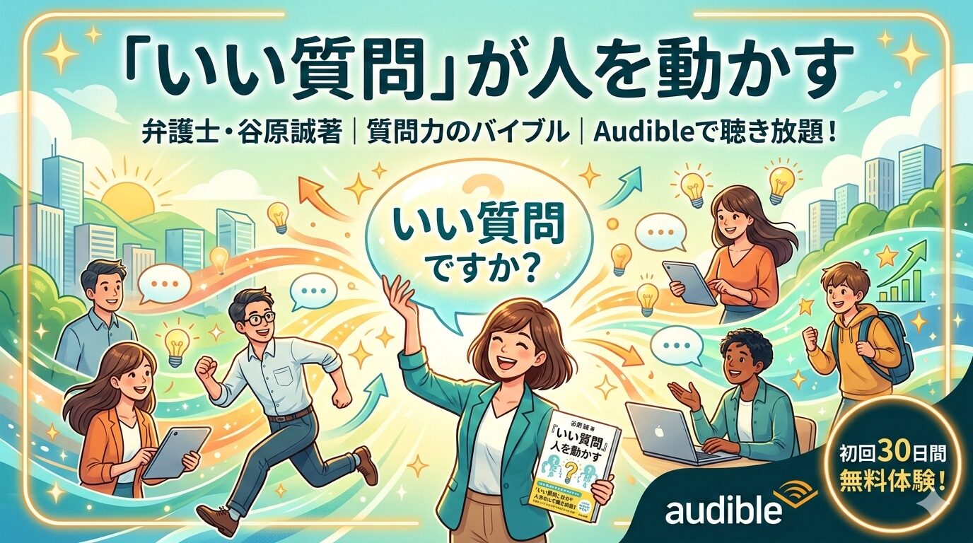 「いい質問」が人を動かす――弁護士・谷原誠が体系化した「質問力」のバイブルは、Audibleの聴き放題対象です。月額1,500円(税込)のプランに含まれており、初回30日間の無料体験を使えば実質0円で全編を聴くことができます。