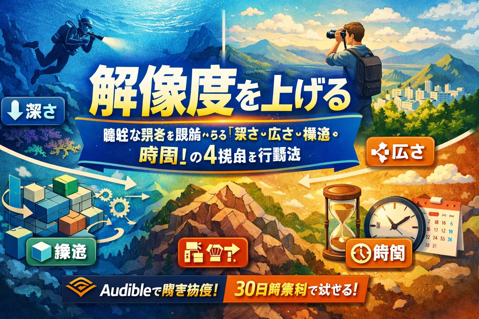 本書は48の型が紹介されたリファレンス的な構成のため、一度読んだだけでは全てを吸収するのは難しい内容です。Audibleの聴き放題なら追加料金なしで何度でも再生できるため、「深さの章だけ聴き直す」「構造の章を通勤中にリピートする」といった使い方が可能です。紙の本を2,420円で購入した上で、復習用にAudibleを併用するのも効果的な活用法です。Audible版の再生時間やナレーションの詳細については、『解像度を上げる』Audible版の詳細レビュー記事でも解説しています。