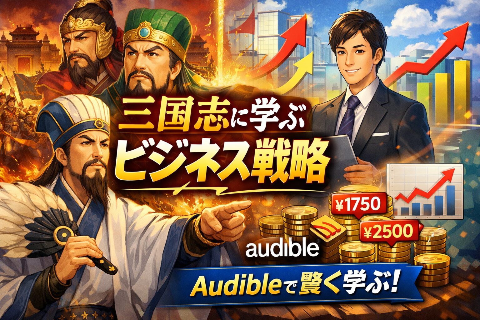 「三国志の知恵を現代のビジネスに活かしたい」——そんなビジネスパーソンに支持されてきた一冊『三国志に学ぶビジネス戦略 ピンチをチャンスに変えた成功法』。本書はAudibleで配信されていますが、聴き放題対象ではなく単品購入が必要です。この記事では、配信状況や価格比較、口コミ、本書の見どころ、お得な入手方法までまとめて解説します。