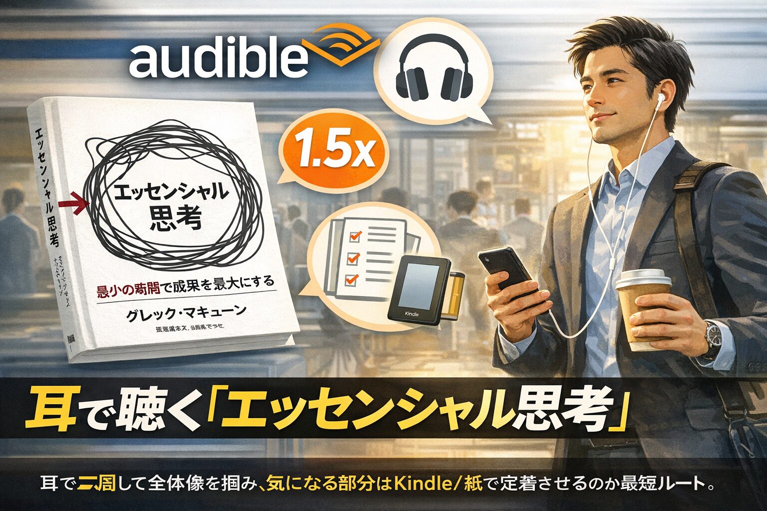 内容は同じですので、ライフスタイルに合わせて選ぶのがよいでしょう。通勤時間や移動中にインプットしたい方にはAudible版、じっくり付箋を貼りながら読み込みたい方には紙書籍がおすすめです。Audible会員価格(1,750円)であれば紙書籍(1,870円)より安く購入できます。