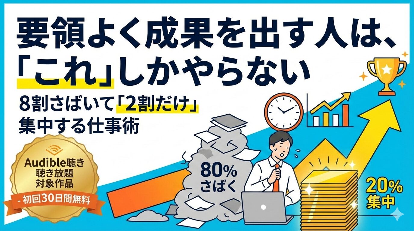KPI管理を通じて組織的に成果を最大化したいという方は、「最高の結果を出すKPIマネジメント」のAudible版もチェックしてみてください。本書の「2割に集中する」という考え方とKPIマネジメントを組み合わせれば、本当に重要な指標に集中するための仕組みを構築できます。